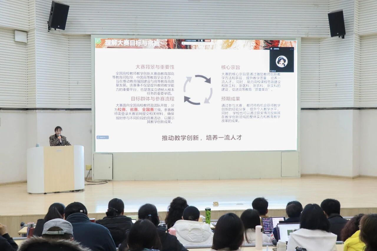本次培训由第五届全国高校教师教学创新大赛获奖教师胡光英主讲。胡老师以“以赛促教、反哺课堂”为导向,围绕大赛背景与宗旨、赛道设置及赛事流程进行系统分析,帮助教师精准定位参赛方向。